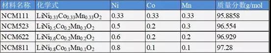中國(guó)儲(chǔ)能網(wǎng)訊:理論三元材料的容量計(jì)算,如下為各三元材料的質(zhì)量分?jǐn)?shù)計(jì)算: