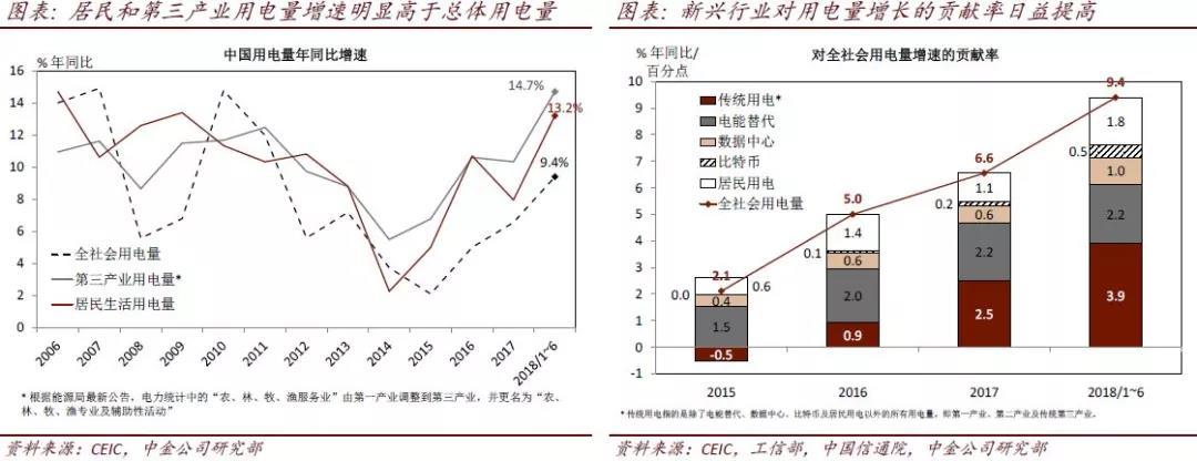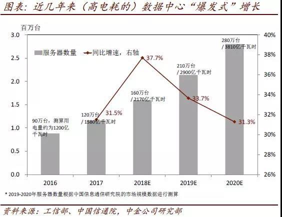 ?此外,近年隨著“新經(jīng)濟(jì)”行業(yè)快速增長(zhǎng),高電耗數(shù)據(jù)中心及數(shù)字貨幣“爆發(fā)式”增長(zhǎng)大幅推高了總用電量。我們估算這些新經(jīng)濟(jì)行業(yè)對(duì)整體用電量增速的貢獻(xiàn)率已占到1.5個(gè)百分點(diǎn)左右。中國信通院預(yù)測(cè),未來3年服務(wù)器數(shù)量有望保持30%以上的增長(zhǎng),對(duì)整體用電量增速的貢獻(xiàn)率在每年1~1.2個(gè)百分點(diǎn)左右。另一方面,我們估算2018年部分“灰色行業(yè)”(如比特幣挖礦)的電耗對(duì)整體用電增長(zhǎng)的貢獻(xiàn)也達(dá)到0.5個(gè)百分點(diǎn)左右[4]。