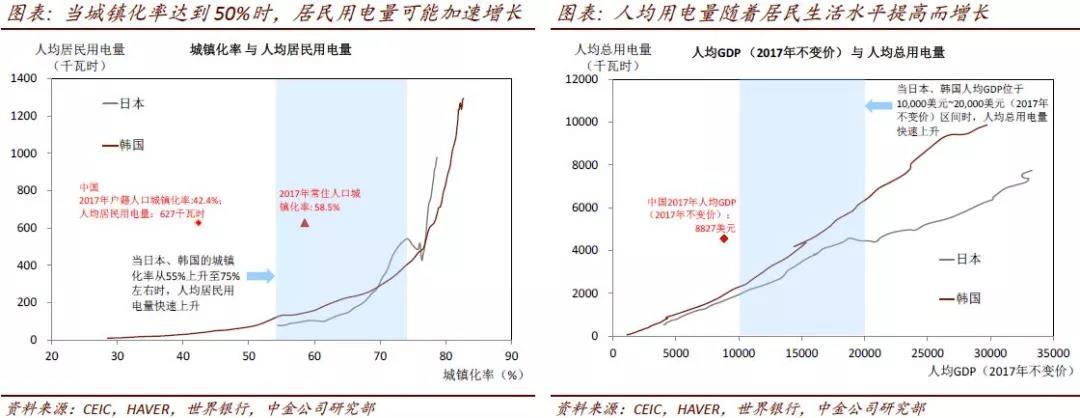 結(jié)論:我們看到市場(chǎng)往往將天氣因素作為電力需求增長(zhǎng)超預(yù)期的回答,但是從我們的測(cè)算來看,天氣固然是誘導(dǎo)居民電力增長(zhǎng)的外因,但是消費(fèi)升級(jí)才是居民電力增長(zhǎng)的內(nèi)因。我們數(shù)據(jù)回歸發(fā)現(xiàn),居民電力消費(fèi),特別是農(nóng)村居民電力消費(fèi)和電器保有量呈高度相關(guān)性??紤]到空調(diào)行業(yè)2017年的銷量加速增長(zhǎng),我們認(rèn)為今年增長(zhǎng)應(yīng)該是受到去年電器銷售的推動(dòng)。另外我們對(duì)比了日韓臺(tái)以及跨國數(shù)據(jù)比較,認(rèn)為居民電力需求增速在城鎮(zhèn)化率達(dá)到50%和人均GDP進(jìn)入10,000美元后會(huì)進(jìn)入10%以上高速增長(zhǎng)區(qū)間。我們預(yù)計(jì)居民用電量未來2年將保持10%的高速增長(zhǎng)。