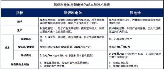 若從兩者的技術(shù)難度與成本來看,鋰電池技術(shù)難度相對較小,生產(chǎn)相對成熟,同時整個制造產(chǎn)業(yè)鏈完善,正處于規(guī)模效應(yīng)的擴大階段,而氫燃料電池的關(guān)鍵材料催化劑、質(zhì)子交換膜、雙極板等國內(nèi)產(chǎn)業(yè)鏈基本處于空白狀態(tài),同時制造成本及加氫站建設(shè)成本等高昂。