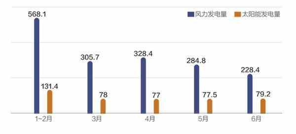 ▲1-6月全國(guó)風(fēng)力與太陽(yáng)能發(fā)電量(單位:億千瓦時(shí))數(shù)據(jù)來(lái)源:國(guó)家統(tǒng)計(jì)局鄒利制圖