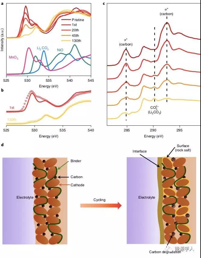 圖4.Li1.2Ni0.15Co0.1Mn0.55O2的表面降解產(chǎn)生更高的過電位。(a)樣品在不同循環(huán)圈數(shù)下充電態(tài)的PEY O K-edge XAS,(b)第1和第130圈時(shí)充(圓圈)放電(曲線)樣品的PEY O K-edge XAS,(c)樣品在不同圈數(shù)下的PEY O K-edge XAS,(d)演示Li1.2Ni0.15Co0.1Mn0.55O2活性材料的界面形成和表面重建,以及循環(huán)過程中碳添加劑的降解過程。