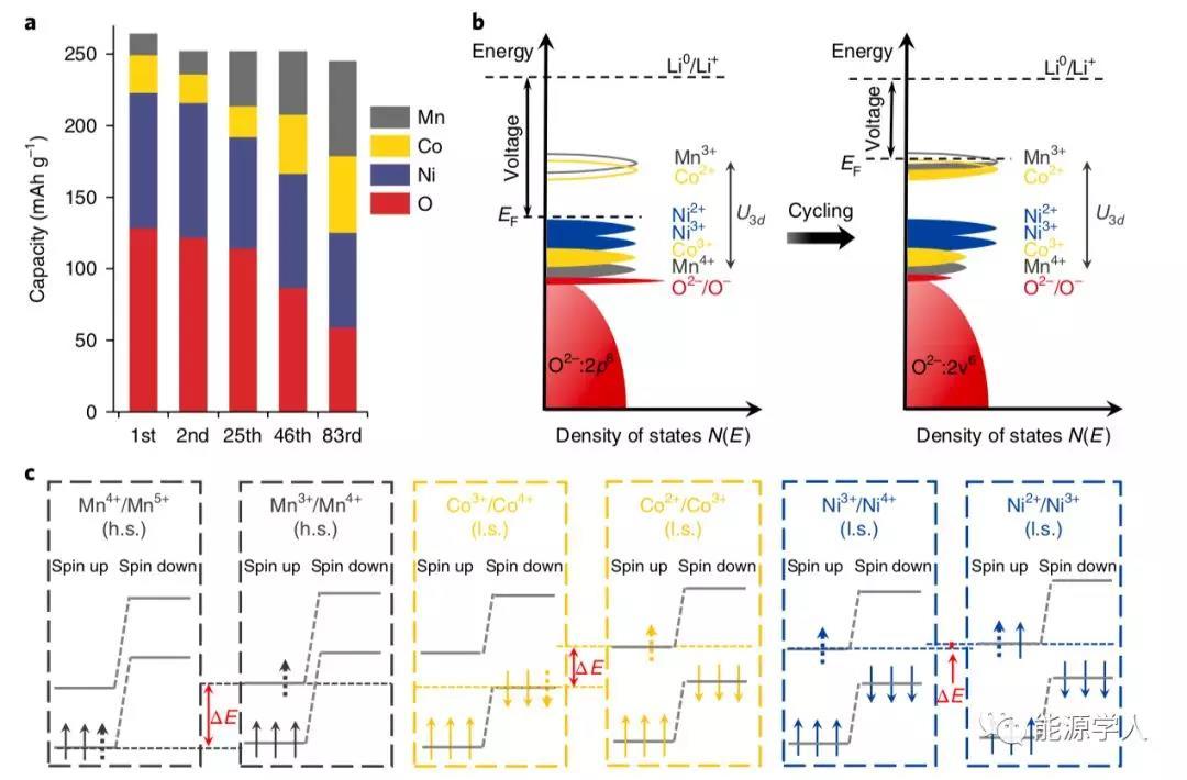 圖3.Li1.2Ni0.15Co0.1Mn0.55O2氧化還原的演變過程。(a)不同循環(huán)圈數(shù)下每種元素的對(duì)放電容量的貢獻(xiàn),(b)由于電子結(jié)構(gòu)變化導(dǎo)致費(fèi)米能級(jí)升高的佐證(c)對(duì)于不同的氧化還原電對(duì),Mn和Co將涉及不同的能級(jí)。