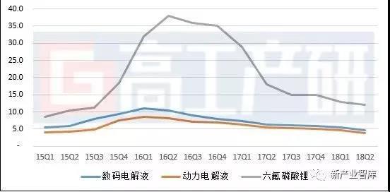 (1)市場價格競爭加劇,市場盈利效應(yīng)減弱:電解液是鋰電池四大主材中成本最為透明的材料,主流電池企業(yè)對電解液議價能力較強,加至市場上衢州杉杉新增六氟磷酸鋰及電解液產(chǎn)能釋放、低價搶占主流動力電池企業(yè)訂單等因素影響,電解液市場在2018Q2價格競爭激烈,三元型動力電解液價格跌至3.5-4.2萬元/噸。