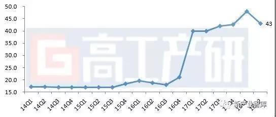 2014Q1-2018Q2中國4.35V鈷酸鋰的均價(萬元/噸)