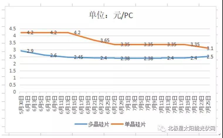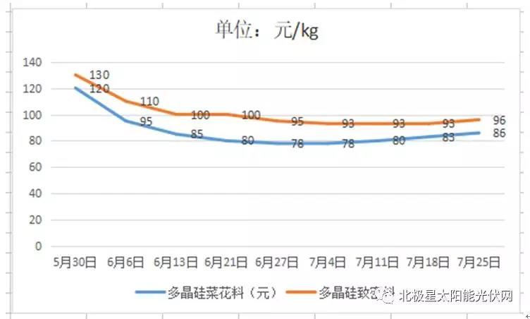 市場驟緊,補貼下調的另一大影響是光伏產品價格大幅下降,據(jù)統(tǒng)計自5月31日以來8周內,多晶硅菜花料均價由120元/kg降至80元/kg上下,致密料均價由130元/kg降至90元/kg左右;多晶硅片均價由4.2元/PC降至3.1,單晶硅片由2.9元/PC降至2.4。
