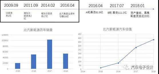 從新能源汽車角度來看,北汽新能源和比亞迪兩者是較為典型的企業(yè),兩個企業(yè)都在新能源乘用車領域邁過了10萬的年銷量等級,從銷售的體量來看與特斯拉相當,他們的情況到底如何,我們以北汽新能源為主要的入口去剖析。這是第一個車企把新能源汽車獨立出來的企業(yè),北汽新能源成立于2009年10月,注冊資本1億元。公司早期融資主要是由北汽主導,累計投資規(guī)模大約21億。在2016和2017年公司分別迚行了A輪30.72億、B輪111.18億融資,總的來說這個企業(yè)已經(jīng)完成融資163億。也是從舊有的車企體系拿到了基礎的開發(fā)體系和車型平臺,算是有底子的了。后續(xù)奇瑞新能源等都是按著這個路子來走,很多車企在新能源汽車里面投入多了,也需要社會資本來填充。