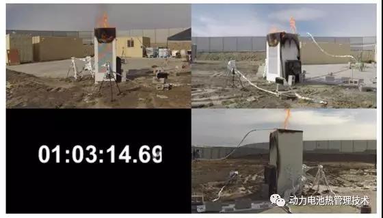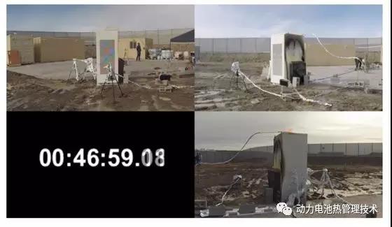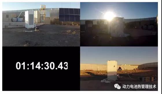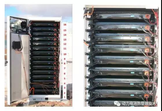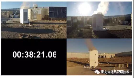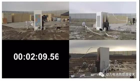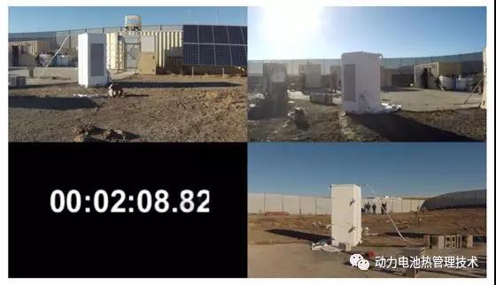 閑話少說,直接看實(shí)驗(yàn)過程,儲(chǔ)能系統(tǒng)布置在空曠的室外,采用兩個(gè)100KWh的儲(chǔ)能單元,實(shí)驗(yàn)前電池處于滿電態(tài),分別對(duì)電池進(jìn)行外部及內(nèi)部加熱,觸發(fā)電池?zé)崾Э兀蛊浒l(fā)生燃燒甚至爆炸。