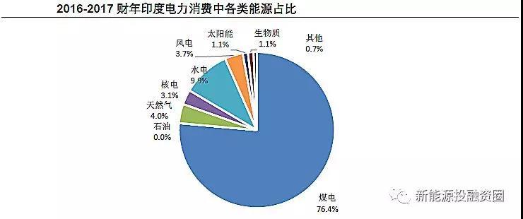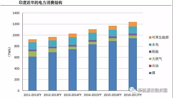 從電力結構來看,由于近年主要的發(fā)電增量來自煤電,印度煤電發(fā)電量占比仍在不斷提升,2016-2017財年達76.4%,較2011-2012財年增長10個百分點。盡管近年印度的風電、光伏也發(fā)展較快,但基數(shù)較小,2016-2017財年風電、光伏合計的發(fā)電量占比僅4.8%,尚未明顯影響到其他電源的發(fā)展。