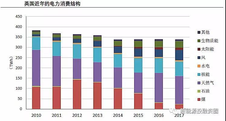 近年英國電力需求呈現(xiàn)小幅下滑的趨勢,其電力結構最顯著的變化是煤電占比的大幅下降以及可再生能源電量占比的快速上升。具體來看,煤電發(fā)電量占比從2010年的28.2%下降至2017年的6.7%,風電、光伏、生物質三大類可再生能源合計的發(fā)電量占比則從2010年的5.9%提升至2017年的27.6%。