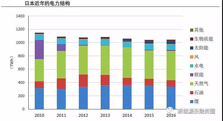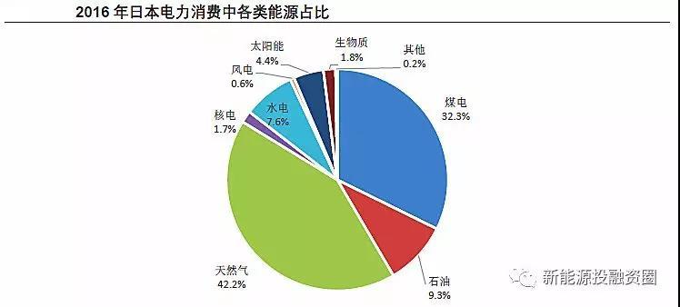 為了彌補核電的空缺,日本火電(包括天然氣和煤電)發(fā)電量占比明顯提升。與此同時,光伏也得到大力發(fā)展,得益于2012年7月啟動的固定上網電價政策,日本光伏裝機迅猛增長,發(fā)電量占比迅速提升,2016年光伏發(fā)電量占比約4.4%。