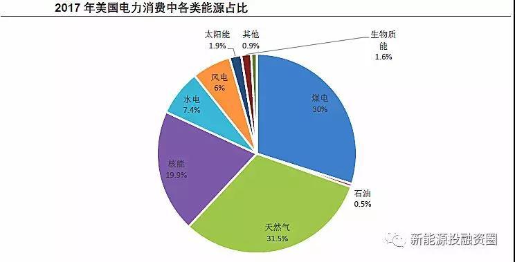 從電力結構來看,2010年以來美國煤電的占比顯著下降,風電和光伏的占比顯著提升,天然氣發(fā)電的占比亦有所提升,核電占比較為穩(wěn)定。具體來看,煤電占比從2010年的44.8%下降至2017年的29.9%,風電、光伏發(fā)電量占比則從2010年的2.3%提升至2017年的8.2%,天然氣從2010年的23.9%提升至2017年的31.5%。