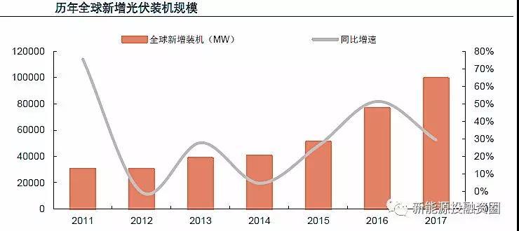 近年全球光伏的發(fā)展勢頭相比風電更為強勁,整體呈現(xiàn)較快增長趨勢,尤其近三年增速均超過20%。2017年全球新增光伏裝機99.1GW,同比增長29.4%,創(chuàng)歷年新高。