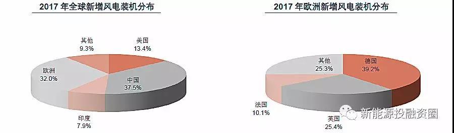 從格局來看,大國引領全球風電行業(yè)的發(fā)展,也占據(jù)著主要的份額。2017年,中國、美國、印度、歐洲占到全球新增裝機的90.7%,新增裝機規(guī)模分別為19.66GW、7.02GW、4.15GW、16.8GW,其中中國新增風電裝機超過全球的三分之一;具體到歐洲市場,德國、英國、法國合計的新增裝機占到歐洲新增裝機的74.7%,裝機規(guī)模分別為6.58 GW、4.27 GW、1.69GW,市場集中度依然很高。