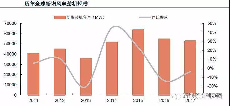 全球風電市場近年呈現(xiàn)震蕩發(fā)展格局,2015年達到高點后,近兩年新增裝機有所下滑,根據(jù)全球風能理事會的統(tǒng)計,2017年全球新增風電裝機52.5GW,同比下滑約4%。