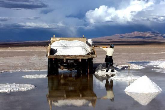 圖:這名男人在玻利維亞烏尤尼的鹽灘工作,這個面積4000平方英里的偏遠(yuǎn)地區(qū)擁有世界上最大的鋰儲量