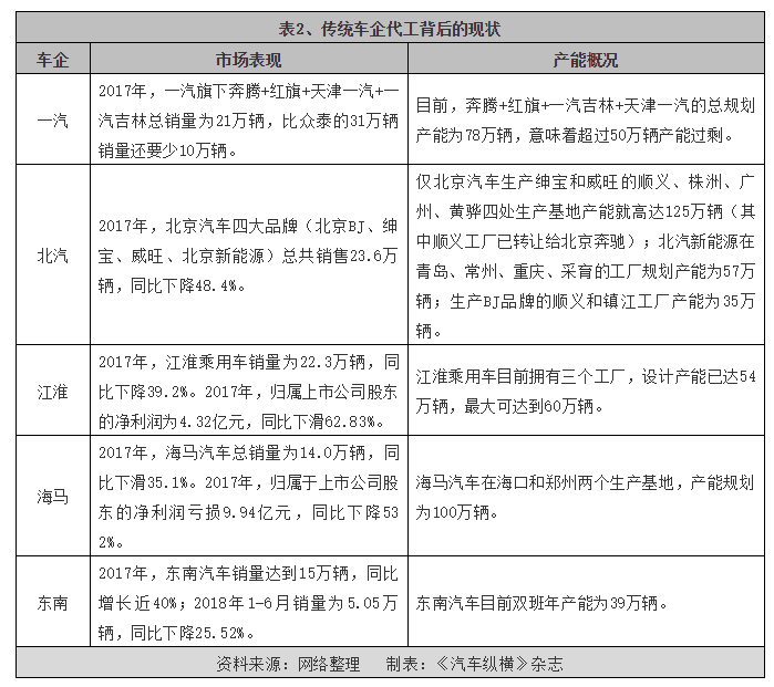 仔細(xì)梳理一番,不難發(fā)現(xiàn),這些有著代工之實的傳統(tǒng)車企都有一些共同點:銷量低迷,產(chǎn)能閑置,急需新能源積分……(見表2)