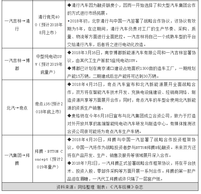 一汽大概是目前代工最多的企業(yè),來自貴州的新造車勢力新特汽車、由汽車設(shè)計公司出身的博郡汽車、清華汽車工程系背景的新造車公司清行汽車,先后找上了一汽集團(tuán)旗下的一汽轎車和一汽吉林,簽署了內(nèi)容大同小異的代工協(xié)議。而另一家新勢力企業(yè)——拜騰,則直接由一汽集團(tuán)出手,從戰(zhàn)略投資擴(kuò)大到零部件采購、產(chǎn)品研發(fā)等環(huán)節(jié),盡管雙方始終未用“代工”來形容合作關(guān)系,但拜騰未獲生產(chǎn)資質(zhì)的情況下,2019年就要量產(chǎn)首款車,只能依靠代工模式(當(dāng)然也不排除坊間流傳的通過收購一汽華利獲得生產(chǎn)資質(zhì)),從這方面來說一汽代工拜騰或許只隔了一層窗戶紙,捅破是早晚的事。