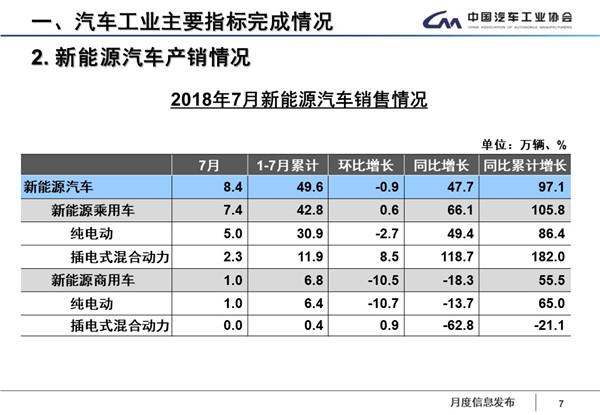 數(shù)據(jù)顯示,今年1-7月,我國新能源汽車產(chǎn)銷分別完成50.36萬輛和49.59萬輛,比上年同期分別增長85.01%和97.12%。其中純電動汽車產(chǎn)銷分別完成38.15萬輛和37.29萬輛,比上年同期分別增長70.95%和82.37%;插電式混合動力汽車產(chǎn)銷分別完成12.19萬輛和12.29萬輛,比上年同期分別增長148.92%和160.93%。因此,許海東表示對我國下半年新能源汽車的產(chǎn)銷成績?nèi)匀挥行判摹?