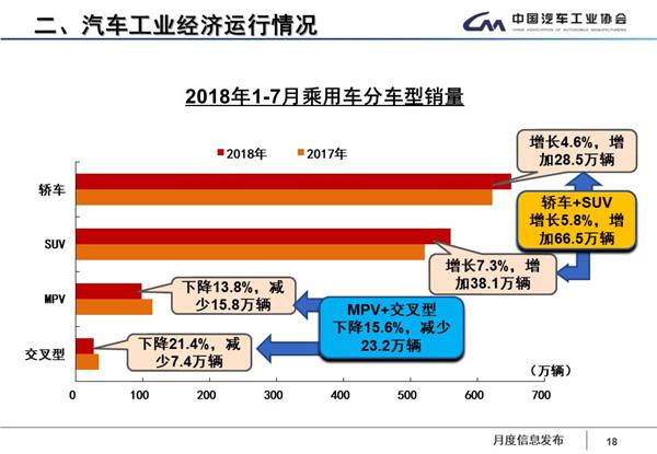 乘用車方面,交叉型乘用車產(chǎn)量與6月相比有所增長,銷量明顯下降,其他品種產(chǎn)銷呈不同程度下降;與上年同期相比,交叉型乘用車產(chǎn)銷快速增長,運(yùn)動型多用途乘用車(SUV)產(chǎn)量持平,銷量小幅下降,其他品種產(chǎn)銷均呈下降,多功能乘用車(MPV)下降更快。