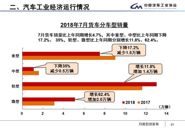 今年上半年商用車是汽車行業(yè)總體產(chǎn)銷增速的“大功臣”,但是從7月的銷售數(shù)據(jù)看,商用車的同比增速也有明顯放緩,從6月的增長18.2%降至3.3%,環(huán)比下降了25%,其中貨車和客車產(chǎn)銷均呈較快下降;與上年同期相比,貨車產(chǎn)銷呈小幅增長,客車略有下降。