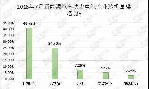 從不同電池企業(yè)來看,寧德時(shí)代以1.36 Gwh的裝機(jī)量位居榜首,占7月總裝機(jī)量的40.72%,對(duì)比6月增長三個(gè)百分點(diǎn);比亞迪位居第二,裝機(jī)量為0.83 Gwh,占比為24.70%,對(duì)比6月下降近三個(gè)百分點(diǎn);力神由6月排名第四上升一位,位居第三,裝機(jī)量為0.24 Gwh,占比為7.29%,對(duì)比6月增長兩個(gè)百分點(diǎn)。