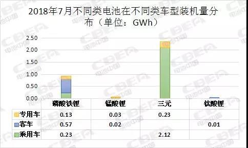 從不同類型電池來看,7月3.34Gwh裝機(jī)總量中,三元?jiǎng)恿﹄姵匮b機(jī)量為2.35 Gwh,占比達(dá)70.26%;磷酸鐵鋰動(dòng)力電池裝機(jī)量為0.93 Gwh,占比為27.81%;錳酸鋰動(dòng)力電池裝機(jī)量為0.05 Gwh,占比為1.59%;鈦酸鋰動(dòng)力電池裝機(jī)量為0.01 Gwh,占比為0.33%。