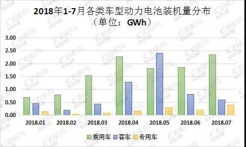 從車輛細(xì)分領(lǐng)域來看,2018年7月,我國新能源乘用車動(dòng)力電池裝機(jī)量為2.35 Gwh,占比達(dá)70.36%,環(huán)比增長27.19%;新能源客車動(dòng)力電池裝機(jī)量為0.60 Gwh,占比為17.95%,環(huán)比下降26.75%;新能源專用車動(dòng)力電池裝機(jī)量為0.39 Gwh,占比為11.69%,環(huán)比增長98.20%。