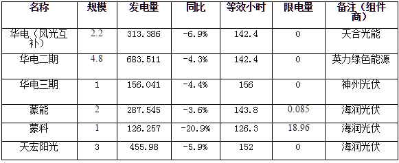 從各風電場項目來看,華電風光互補電場2.2萬千瓦光伏發(fā)電場發(fā)電量為313.386萬千瓦時,等效發(fā)電小時約為142.4小時;華電二期4.8萬千瓦光伏發(fā)電場發(fā)電量為683.511萬千瓦時,等效發(fā)電小時約為142.4小時;華電三期1萬千瓦光伏發(fā)電場發(fā)電量為156.041萬千瓦時,等效發(fā)電小時約為156小時,為我市7月份光伏等效利用小時數(shù)最高;蒙能新能源2萬千瓦光伏發(fā)電場發(fā)電量為287.545萬千瓦時,等效發(fā)電小時143.8小時;蒙科金太陽1萬千瓦光伏發(fā)電場發(fā)電量為126.257萬千瓦時,等效發(fā)電小時126.3小時;天宏陽光3萬千瓦光伏發(fā)電場發(fā)電量為455.98萬千瓦時,等效發(fā)電小時152小時。