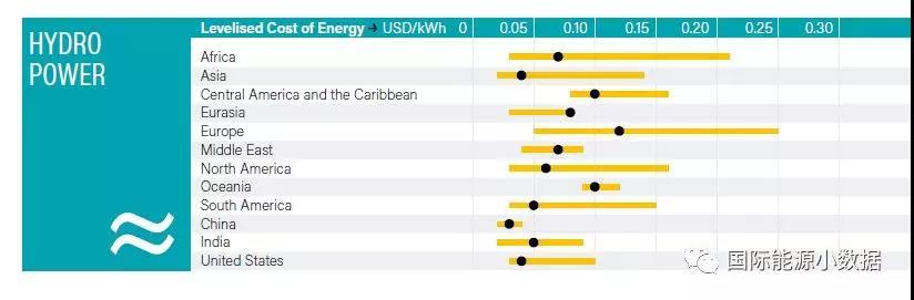由上表可見,水電的全生命周期內(nèi)平準成本在印度最低,其次是中國、美國、南美;歐洲平準成本最高,其次是大洋洲、中美洲。
