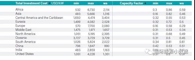 2017年全球各地區(qū)地水電電加權平準成本(美元/千瓦時)、單位裝機投資成本、運行容量系數(shù)如下: