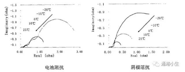 電池阻抗主要體現(xiàn)為電化學(xué)反應(yīng)阻抗,而歐姆阻抗相對(duì)較小。由下圖可知。隨著溫度的下降,電池阻抗逐漸上升,且下降至0°C以后,阻抗速度增大,陰極阻抗呈類似的趨勢(shì),從數(shù)值上來看,電池的阻抗主要來源于陰極阻抗的貢獻(xiàn)。