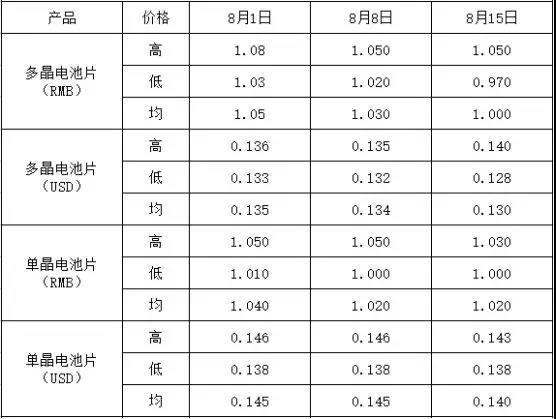 預(yù)計(jì)近期電池片價(jià)格還會(huì)繼續(xù)下滑,到8月底,單晶電池片將跌破1元/W,單、多晶電池價(jià)差小于0.05元/W.考慮到PERC單晶組件需求下降,未來(lái)PERC單晶電池降幅將與普通單晶基本保持一致。對(duì)海外市場(chǎng)而言,報(bào)價(jià)降幅需要超過(guò)人民幣貶值速度,否則很難擁有足夠競(jìng)爭(zhēng)力。