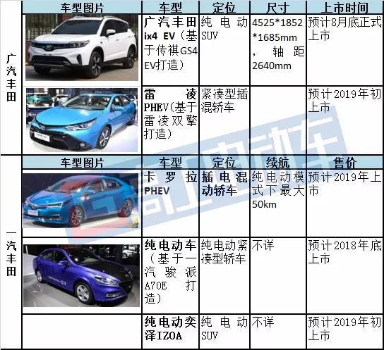 首款新能源車:廣汽豐田首款純電動SUV——ix4 EV基于廣汽傳祺GS4 EV 打造而來,外觀有小幅調(diào)整;而一汽豐田也在去年11月發(fā)布了首款純電動車,基于駿派A70E打造。以下是近兩年的新能源車規(guī)劃:
