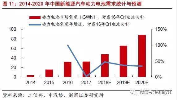 相應(yīng)地,我們更新測算,預(yù)計(jì)2018-2020年,我國動力電池市場需求分別為47.89GWh、65.51GWh、88.03GWh,同比增速分別為47.3%、36.8%、34.4%,如圖11所示。