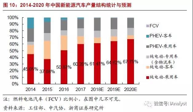 我們判斷,純電動乘用車將成為未來新能源汽車市場的重要增量,預(yù)計(jì)2020年產(chǎn)量將達(dá)到135.50萬輛,約占當(dāng)年新能源汽車總產(chǎn)量的2/3,自2017年的年均復(fù)合增速為41.5%。2014-2020年中國新能源汽車產(chǎn)量結(jié)構(gòu)如圖10所示。