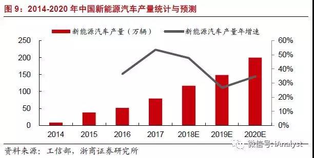 據(jù)中汽協(xié)統(tǒng)計(jì),2017年,我國新能源汽車產(chǎn)量為79.4萬輛,同比增長53.8%,占當(dāng)年汽車行業(yè)總產(chǎn)量(2,902萬輛)的比例卻僅為2.74%。我們認(rèn)為,新能源汽車市場尚處于發(fā)展早期,未來受益政策推動、科技創(chuàng)新,產(chǎn)業(yè)快速成長的勢頭未來仍將持續(xù)十年甚至幾十年。我們更新預(yù)測,預(yù)計(jì)2018~2020年,我國新能源汽車產(chǎn)量將分別達(dá)到117.3萬輛、148.6萬輛、200萬輛(原預(yù)測為110.8萬輛、147.4萬輛、200萬輛),保持快速增長勢頭,如圖9所示。