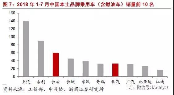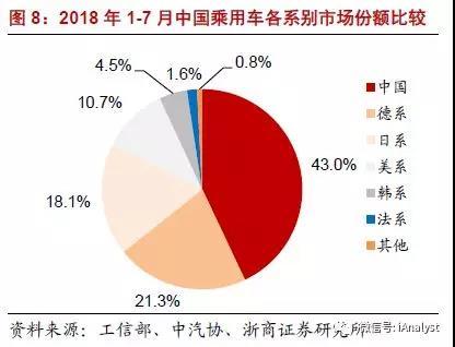 總的來說,2018年1-7月,在以燃油車為主的中國乘用車市場中,外資車系仍占主流,合計(jì)份額為57%。其中,德系、日系占比居前,份額分別為21.3%和18.1%,如圖8所示。由此可見,如果未來外資車企發(fā)力中國新能源乘用車市場,將進(jìn)一步加快乘用車電動化趨勢。