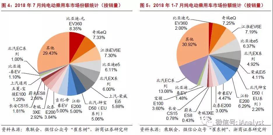 1-7月純電動乘用車市場累計(jì)銷量位于前列的車型有:北汽EC系列,4.04萬輛;奇瑞eQ,2.24 萬輛;江淮iEV6E,2.22萬輛;比亞迪e5,1.97萬輛;江鈴E200,1.94 萬輛。我們據(jù)此測算,這5款車型合計(jì)銷量為10.5萬輛,占純電動乘用車總銷量的40.3%,如圖5 所示。