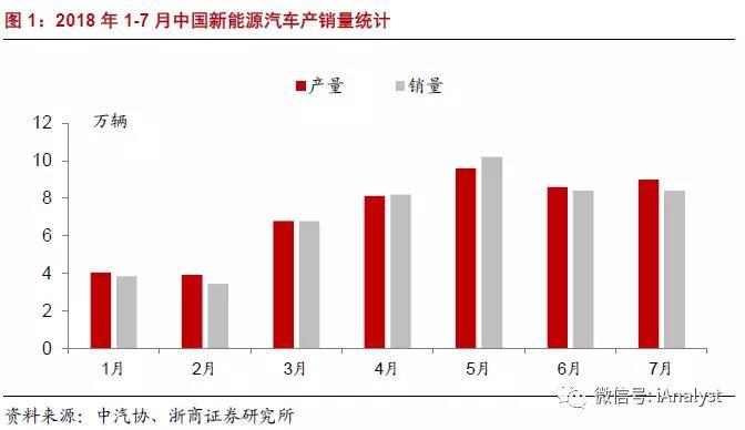 據(jù)中國汽車工業(yè)協(xié)會統(tǒng)計(jì),2018年7月新能源汽車產(chǎn)銷量分別為9.0萬輛、8.4萬輛,同比增長53.6%、47.7%,環(huán)比分別增長5.5%、下降0.9%;1-7月累計(jì)產(chǎn)銷量分別為50.4萬輛、49.6萬輛,同比增長85.0%、97.1%。2018年以來各月份的產(chǎn)銷統(tǒng)計(jì)如圖1所示。