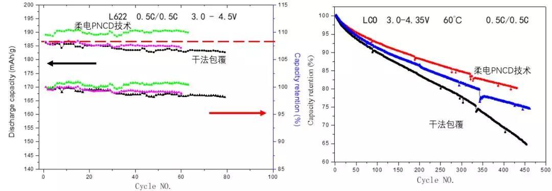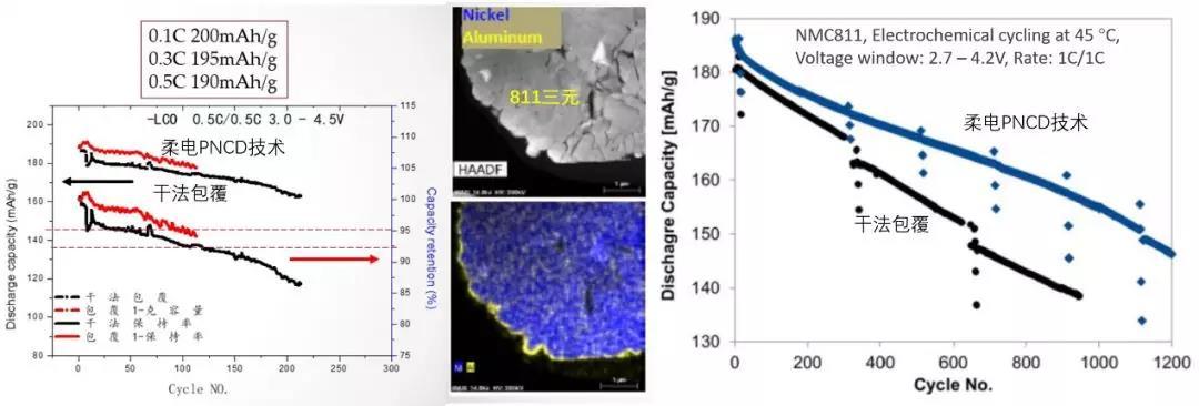 中國(guó)儲(chǔ)能網(wǎng)訊:近日,柔電科技在廣州舉行的2018年亞洲動(dòng)力電池與儲(chǔ)能技術(shù)峰會(huì)上,提出了高容量、高電壓、耐高溫鋰電池材料的解決方案。通過(guò)自主開(kāi)發(fā)的精準(zhǔn)納膜包覆與摻雜技術(shù)(Precise Nano Coating and Doping, 簡(jiǎn)稱(chēng)PNCD),可以大幅提升現(xiàn)有鋰電池正負(fù)極材料的循環(huán)性能、耐高電壓性能以及耐高溫性能。通過(guò)和國(guó)內(nèi)外多家知名材料企業(yè)的合作,該技術(shù)在高電壓4.5V鈷酸鋰、4.5V中鎳三元(532和622型)、常壓高鎳三元(811和NCA型)以及富鋰錳基都顯示出比同類(lèi)產(chǎn)品性能有明顯的提升。通過(guò)該技術(shù),LiCoO2電池截止電壓可以提升到4.5 V,在0.1C電流密度下容量接近200mAh/g,C/2的倍率下容量達(dá)到190 mAh/g,100圈以后容量保持在95%以上。而532和622三元的中鎳高電壓(4.5V)容量達(dá)到~190mAh/g, 循環(huán)100次后衰減<1%。 而811三元在45度下循環(huán)壽命可達(dá)到1200圈,未處理的811材料只有600圈;而24小時(shí)脹氣率也只有未處理電池的60%(以上數(shù)據(jù)均來(lái)自于軟包電池)。