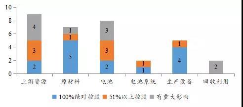 從交易事件數(shù)量看,上游資源、電池、原材料和生產(chǎn)設(shè)備領(lǐng)域的交易事件較多,分別為9件、8件、7件和5件。深入到交易后達(dá)成的控制程度看,生產(chǎn)設(shè)備和原材料領(lǐng)域獲得“100%絕對(duì)控制權(quán)”的比例較高,分別為80%和71%;獲得“51%以上控制權(quán)”比例較高的領(lǐng)域有生產(chǎn)設(shè)備、電池系統(tǒng)、原材料和上游資源4個(gè)領(lǐng)域,其中生產(chǎn)設(shè)備和電池系統(tǒng)領(lǐng)域的所有并購在交易后均達(dá)到了對(duì)被并購公司的控制,原材料和上游資源領(lǐng)域有一半以上的并購在交易后達(dá)到了對(duì)被并購公司的控制?;厥疹I(lǐng)域并購后均對(duì)被并購單位產(chǎn)生重大影響。