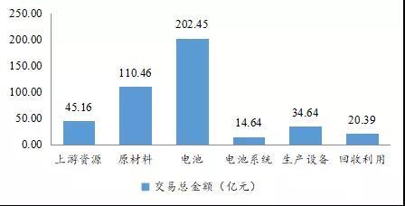 從交易金額看,6個(gè)細(xì)分領(lǐng)域共涉及交易金額427.74億元(1美元按6.6元人民幣折算,不包含金額不確定的并購事件),電池及上游原材料、上游資源領(lǐng)域的交易金額較高,電池研發(fā)生產(chǎn)之后的電池系統(tǒng)、生產(chǎn)設(shè)備、回收利用領(lǐng)域的交易金額較低,其中電池領(lǐng)域的交易金額最大,為202.45億元,占總交易金額的47.33%。