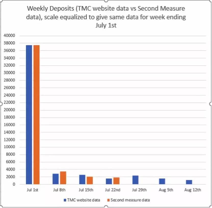 特斯拉汽車俱樂(lè)部(Tesla Motors Club,下稱“TMC”)網(wǎng)站上的Model 3訂單跟蹤表(Model 3 Order Tracker spreadsheet),按日期跟蹤新配置的車輛。在下面的圖表中,我將Second Measure數(shù)據(jù)與TMC表格的數(shù)據(jù)進(jìn)行了比較。