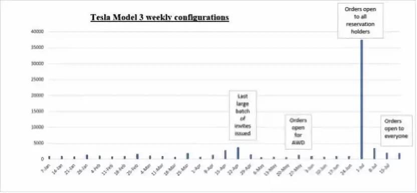 1.當(dāng)特斯拉對(duì)所有Model3預(yù)訂用戶開(kāi)放選配時(shí),訂單數(shù)量出現(xiàn)了暫時(shí)的大幅增長(zhǎng)。