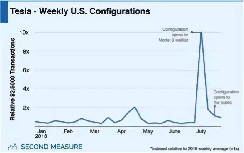Second Measure 分析了信用卡和借記卡交易,來(lái)估計(jì)特斯拉從今年1月開(kāi)始每周收到的Model 3的確認(rèn)訂單數(shù)量(即已支付2500美元不可退還的預(yù)付款)。