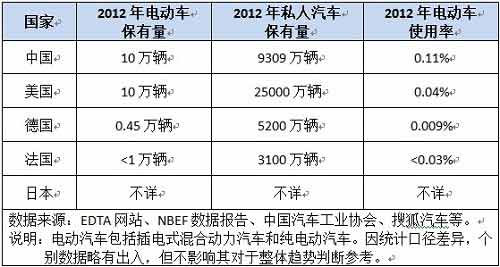 截止到2012年,中、美、德、法、日五個(gè)全球最大的電動(dòng)汽車市場(chǎng)的社會(huì)電動(dòng)車使用率非常低。
