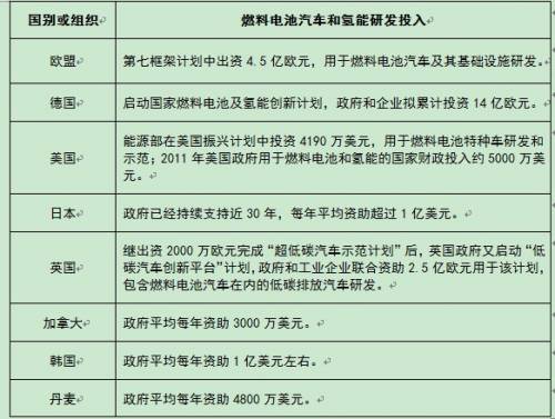 表3 全球主要組織、國(guó)家和企業(yè)投入燃料電池汽車(chē)和氫能研發(fā)資金統(tǒng)計(jì)表
