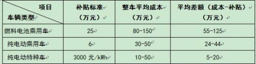 2009年初,財(cái)政部、科技部、國(guó)家發(fā)展改革委、工業(yè)和信息化部(以下簡(jiǎn)稱(chēng)四部委)聯(lián)合召開(kāi)啟動(dòng)會(huì),共同啟動(dòng)“十城千輛”節(jié)能與新能源汽車(chē)示范推廣試點(diǎn)工程,決定在公交、出租、環(huán)衛(wèi)、公務(wù)、郵政等公共服務(wù)領(lǐng)域開(kāi)展節(jié)能與新能源汽車(chē)購(gòu)買(mǎi)試點(diǎn)工作。與此同時(shí),國(guó)家頒布了《節(jié)能與新能源汽車(chē)示范推廣財(cái)政補(bǔ)助資金管理暫行辦法》,燃料電池轎車(chē)、純電動(dòng)汽車(chē)和純電動(dòng)特種車(chē)均納入公共服務(wù)用乘用車(chē)和輕型商用車(chē)類(lèi),由于其具有100%節(jié)油率水平,分別獲得了國(guó)家財(cái)政補(bǔ)貼25萬(wàn)元/輛、6萬(wàn)元/輛和3000元/kWh標(biāo)準(zhǔn),如表4。從補(bǔ)貼額度上看,燃料電池汽車(chē)獲得了更多的國(guó)家財(cái)政補(bǔ)貼額度,但是從財(cái)政補(bǔ)貼與整車(chē)成本差值平均值看,由于燃料電池汽車(chē)整車(chē)成本高,在獲得相應(yīng)國(guó)家補(bǔ)貼之后,仍然存在很大的差額,這必將阻礙燃料電池汽車(chē)示范推廣。因此,政府應(yīng)調(diào)整新能源汽車(chē)財(cái)政補(bǔ)貼標(biāo)準(zhǔn),引導(dǎo)燃料電池汽車(chē)發(fā)展。