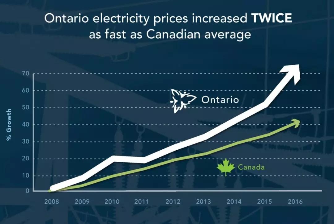 據(jù)Fraser Institute提供的研究報告,2017年,安大略電力客戶總共上繳了18.5億美元的GA費(fèi)用,僅安大略最大的兩個城市多倫多和渥太華, 2010與2016年相比商業(yè)電費(fèi)增長了50%,而其他加拿大城市平均增長14%。